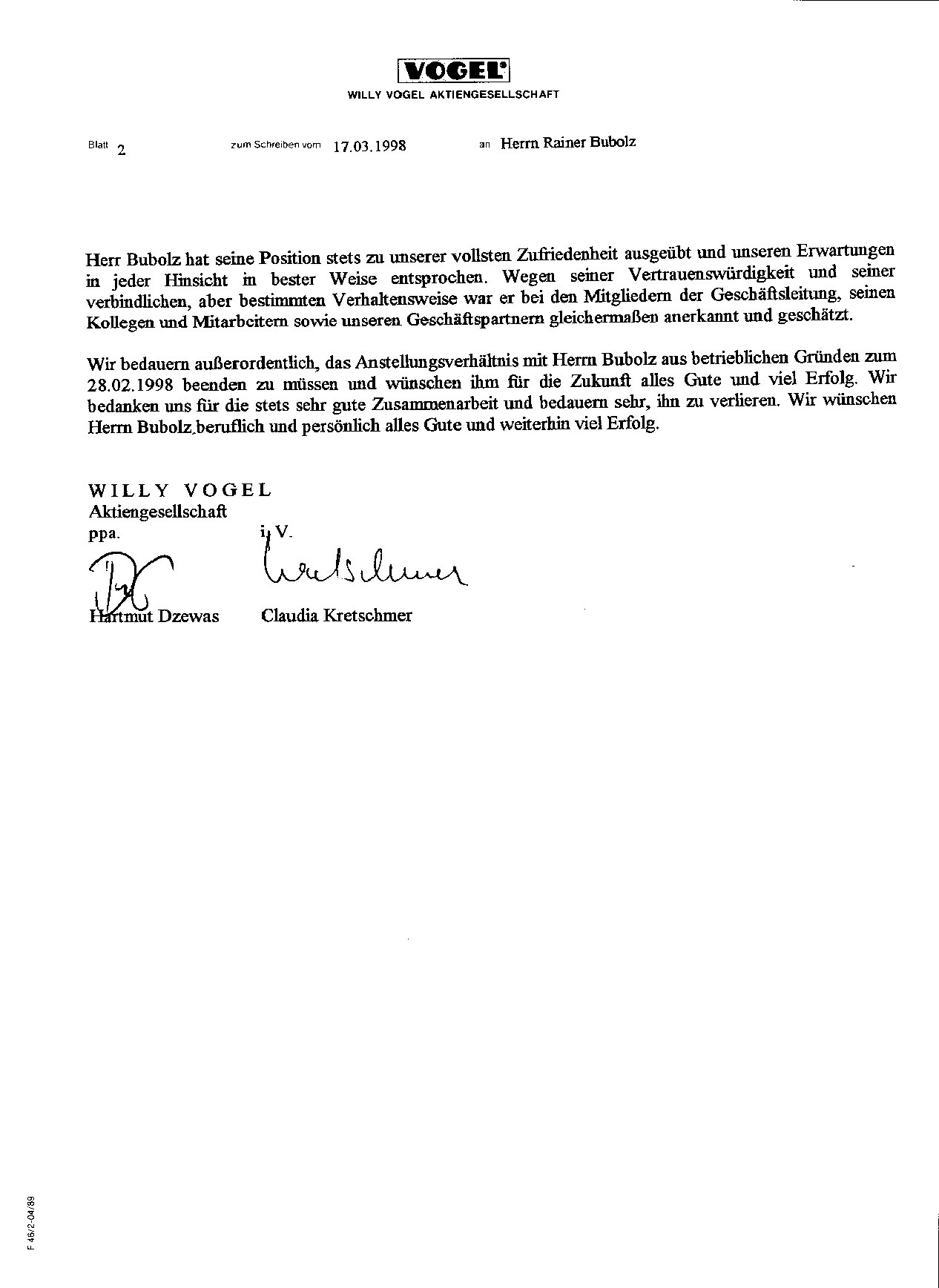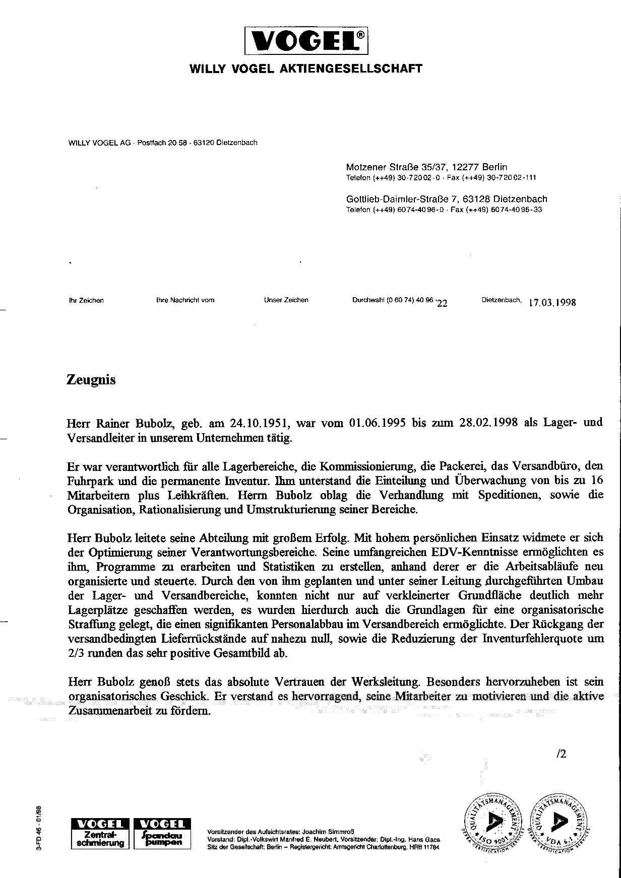 Zeugnis Willy Vogel AG, Lager- & Versandleiter